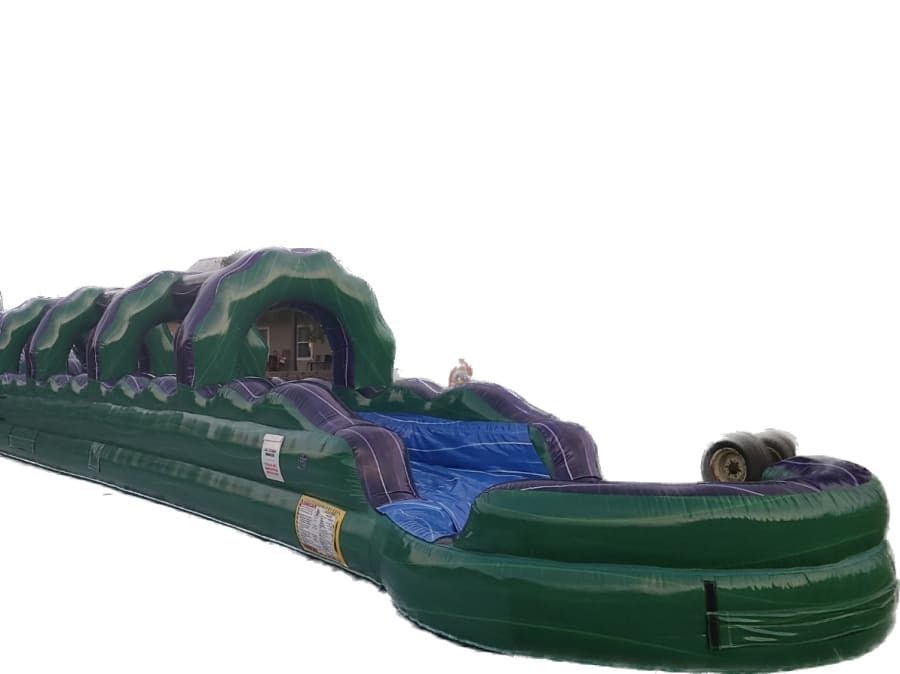 The slip and slide portion of our giant hulk water slide rented as a stand alone unit. As a slip and slide you don't need to climb a whopping 30 feet, you just need a bit of a running start and water you can still enjoy the entire length of the slippery lanes all the way to the splash pond. Suitable for children of all sizes, we can't in good confidence call full grown humans using a slip and slide for a comic book character adults.. but full sized humans are encouraged to have just as much fun as the underdeveloped ones. This sizable slip and slide comes out to a whopping 18x65x10 and requires 25x75x14 to set up.