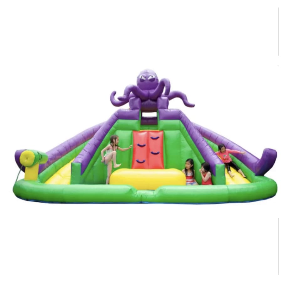 Twice the slides, means twice the fun and the water cannon keeps the pool full. Pool is aprox 7" deep but generally only holds 2-3 inches, kind of like a deep splash pad. The entire inflatable is 12x20x6 and requires 14x22x8 of space to setup.